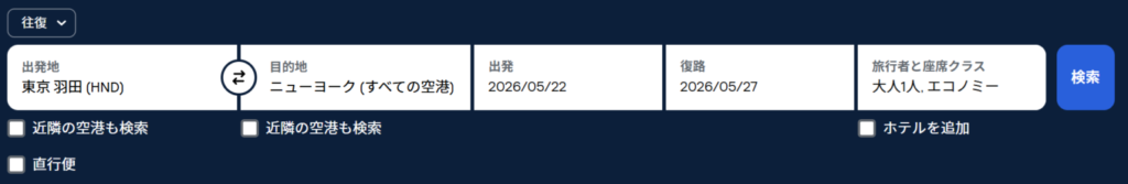 また、デフォルトでは「往復」の航空券を検索するようになっていますが、