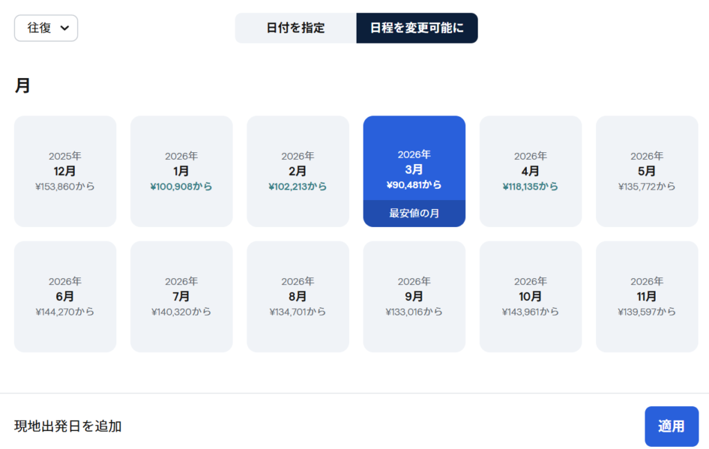 さらに、[日程を変更可能に]を選択すると、各月毎の値段の傾向が一目でわかります。