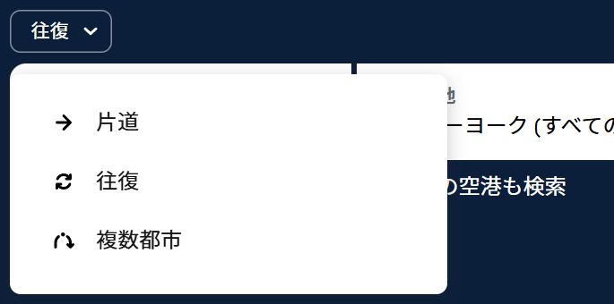 以下ドロップダウンリストから「片道」や「複数都市」に変更することができます。