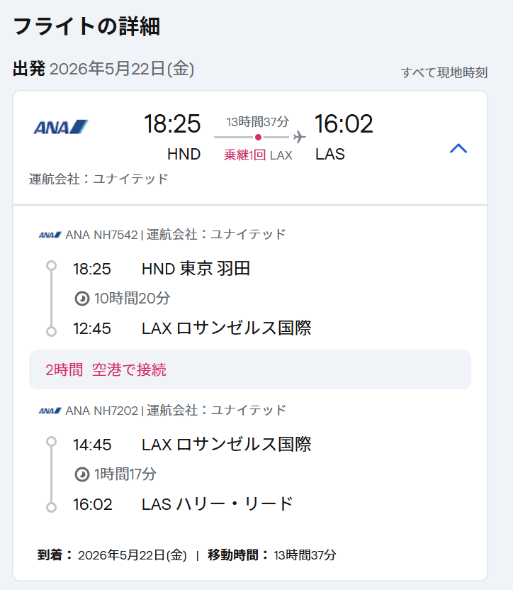 乗り継ぎがある場合は乗り継ぎの空港や時間の情報も確認できます。
