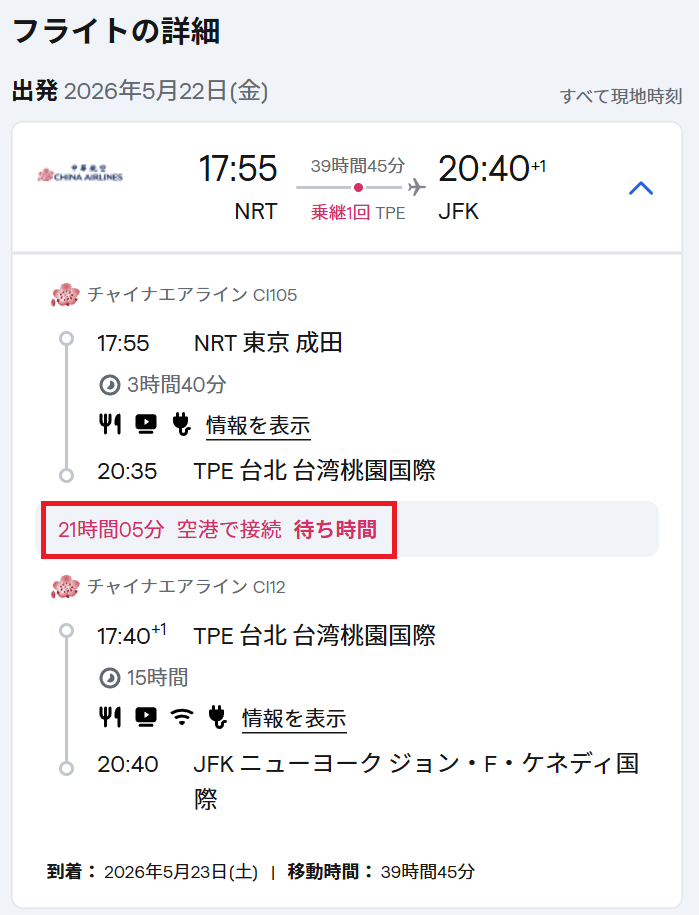 以下は成田発ニューヨーク行きのフライトで乗り継ぎ時間が長い一例です。