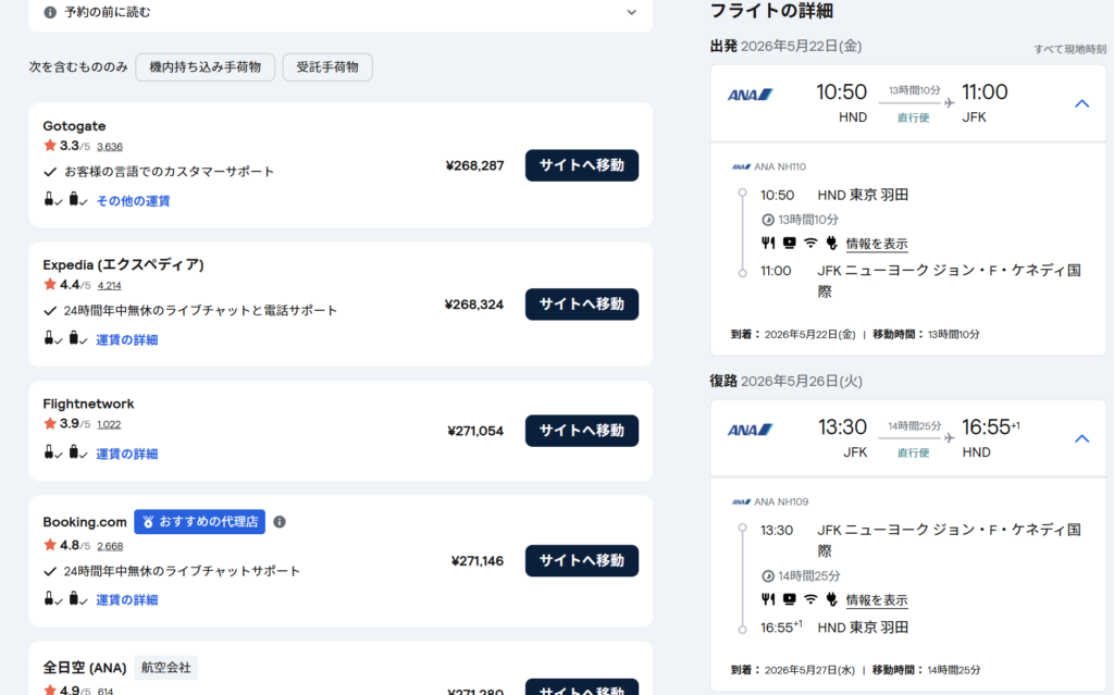 こちらの画面では、具体的な出発/到着時刻や所要時間、航空会社、価格が確認できます。